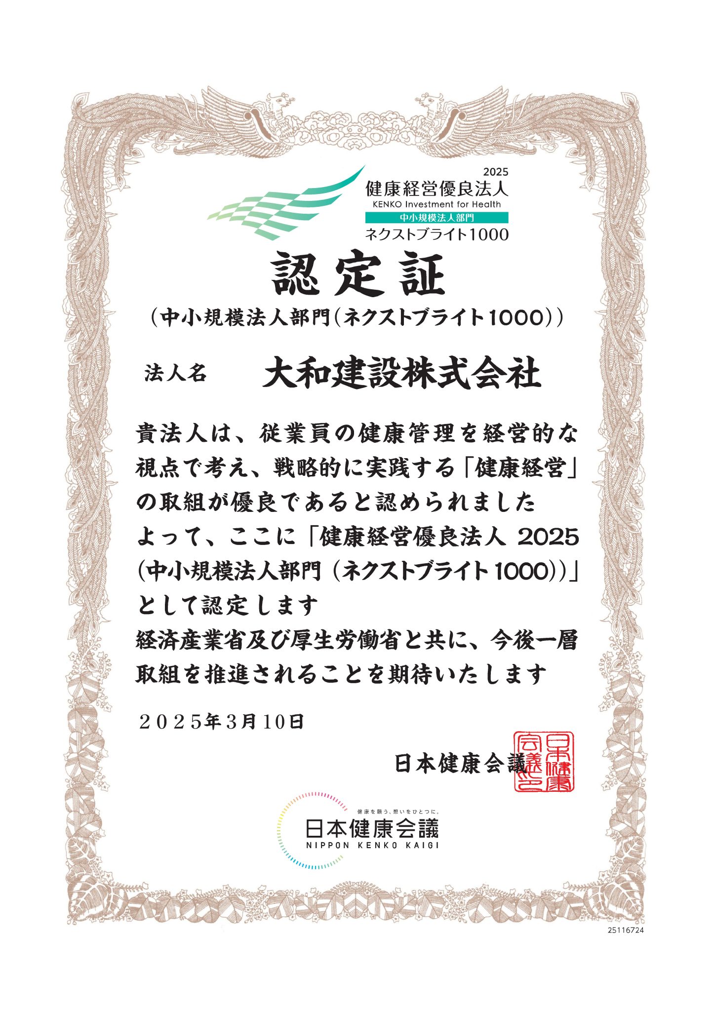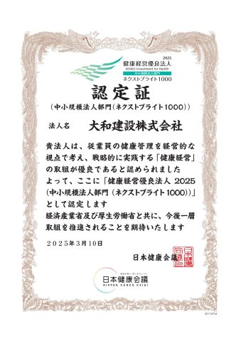 今年度は「中小規模法人部門」から「ネクストブライト1000」に認定されました。